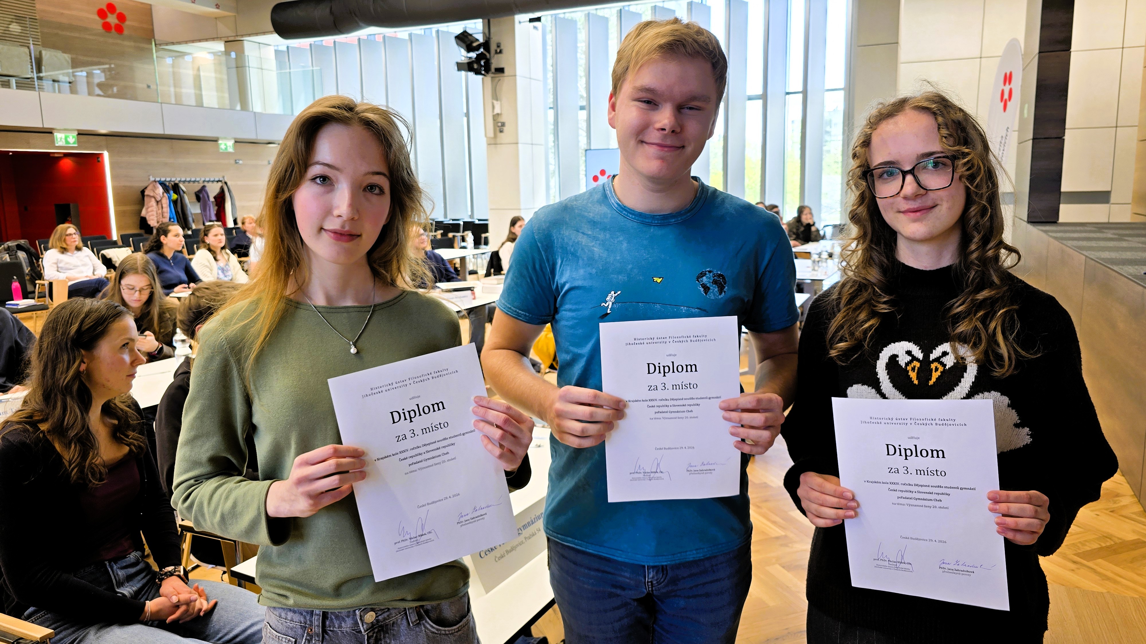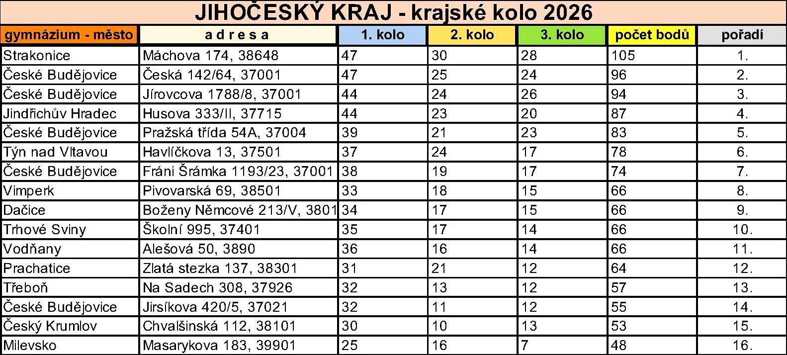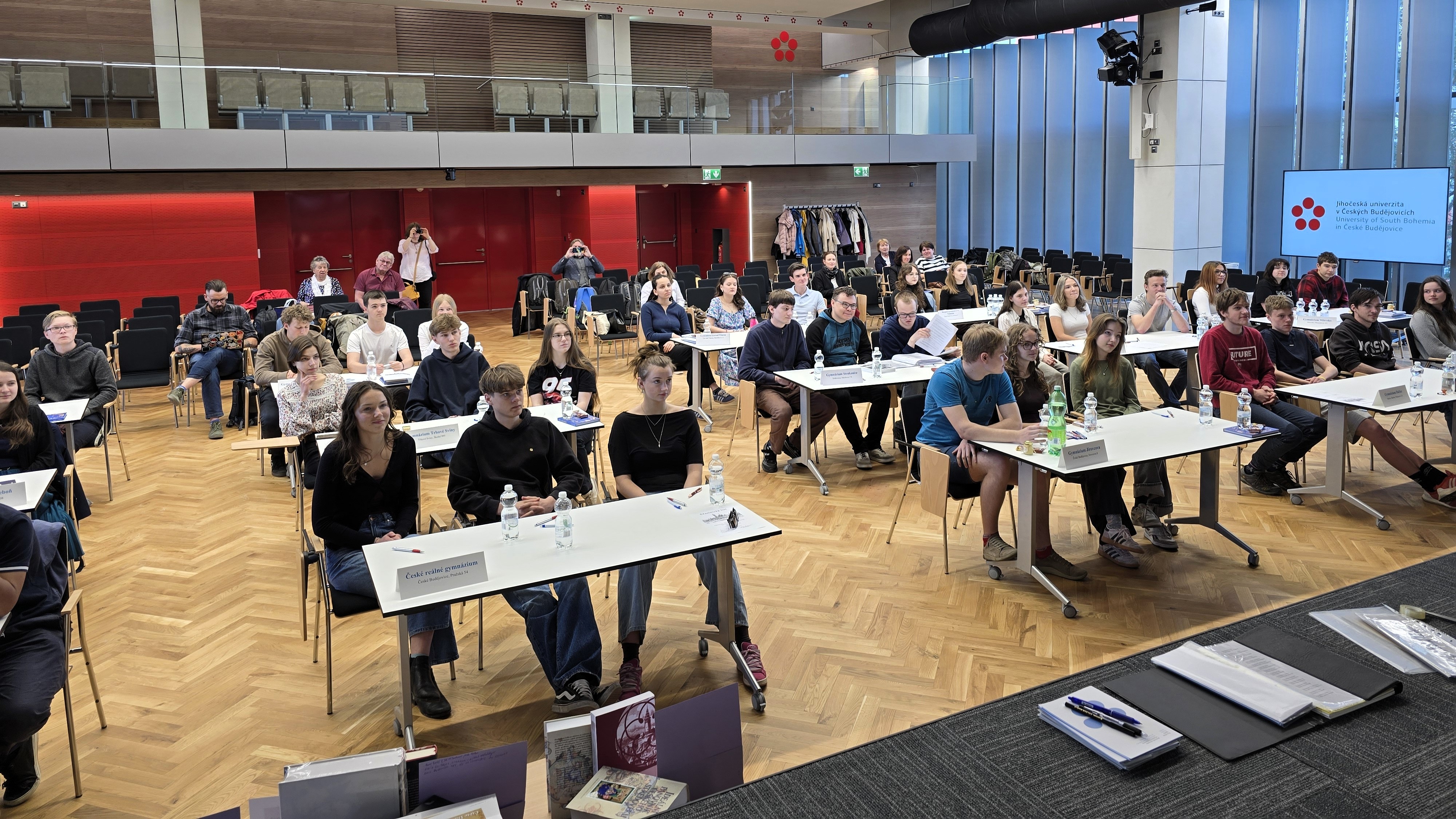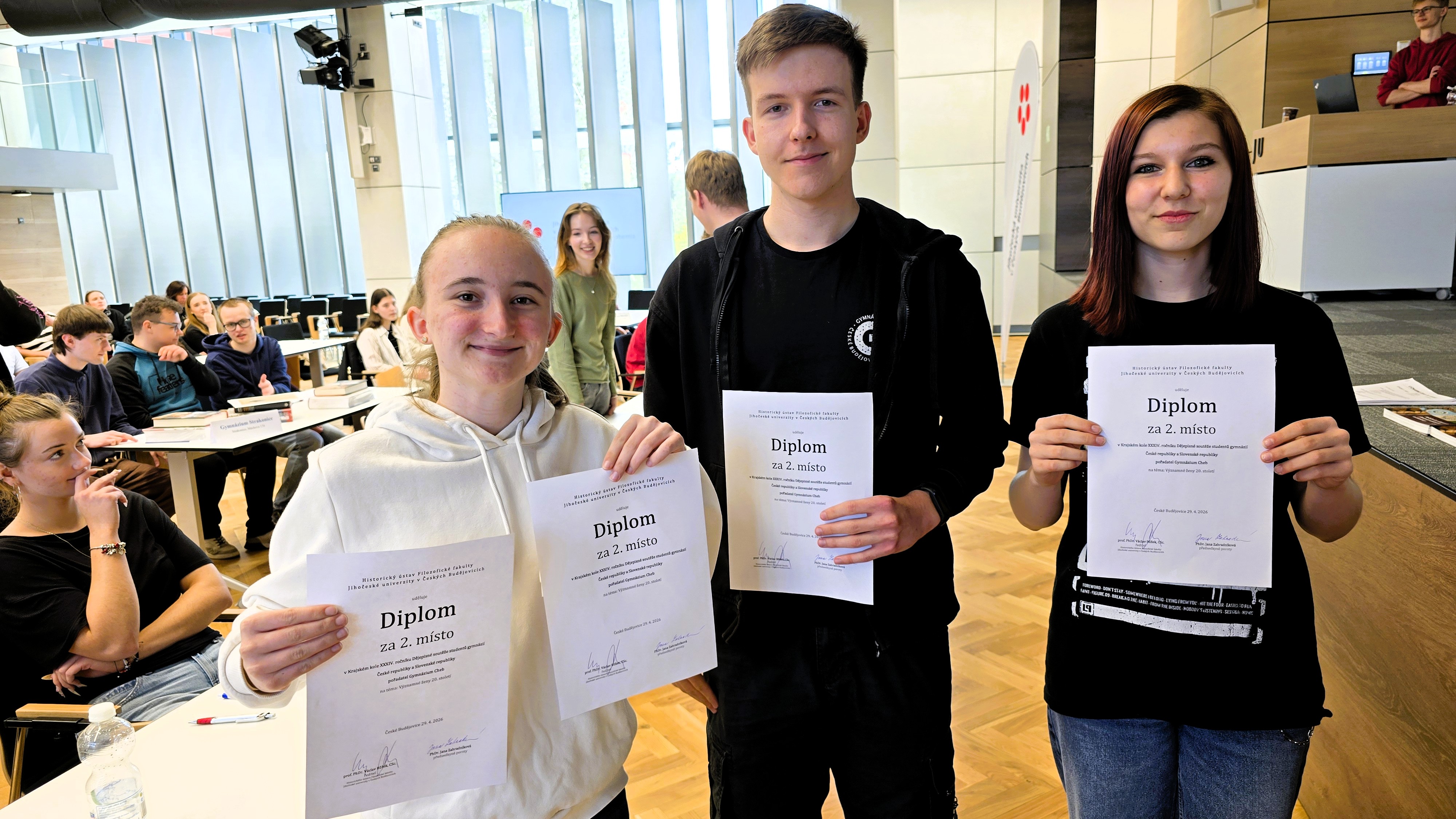V Aule Jihočeské univerzity v Českých Budějovicích se konalo ve středu 29. dubna 2026 krajské kolo již XXXIV. ročníku Dějepisné soutěže studentů gymnázií České republiky a Slovenské republiky. Organizace této významné události se tradičně ujaly Gymnázium Jírovcova spolu s Historickým ústavem Filozofické fakulty Jihočeské univerzity. Celkem šestnáct tříčlenných družstev z jihočeských gymnázií poměřilo své vědomosti v hodinu trvajícím a vysoce náročném testu, jehož tématem se v letošním roce staly významné ženy 20. století. V silné konkurenci obsadili nejvyšší příčku studenti z Gymnázia Strakonice. Na druhém místě je následovali soutěžící z Gymnázia Česká v Českých Budějovicích. Třetí příčka patřila družstvu českobudějovického Gymnázia Jírovcova. Všechny tři nejvýše umístěné týmy si na základě vynikajícího výkonu vysloužily kvalifikaci do celostátního kola soutěže, které proběhne v Chebu.