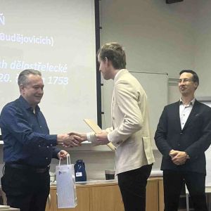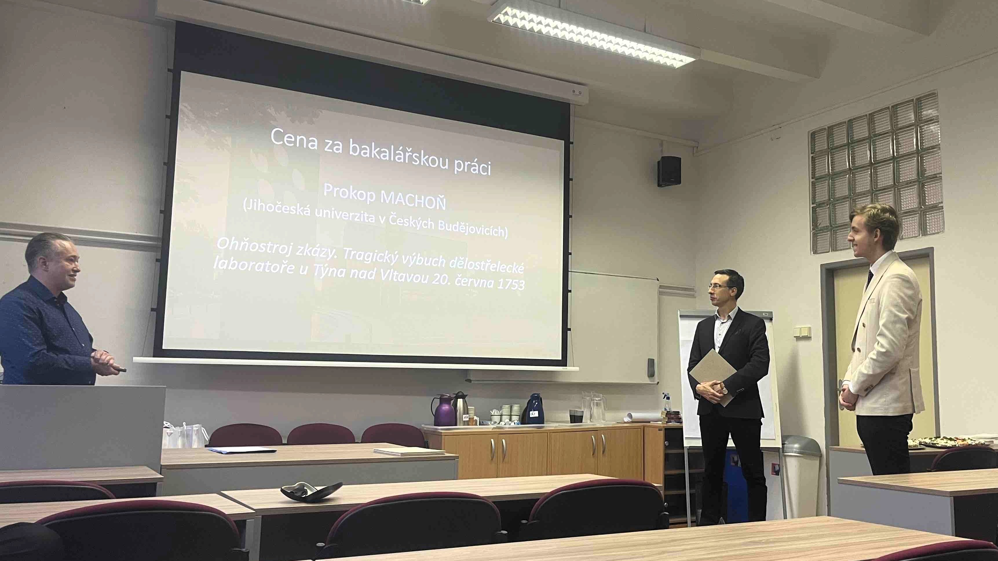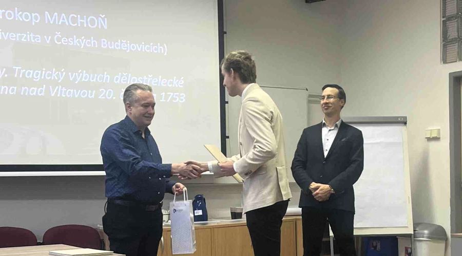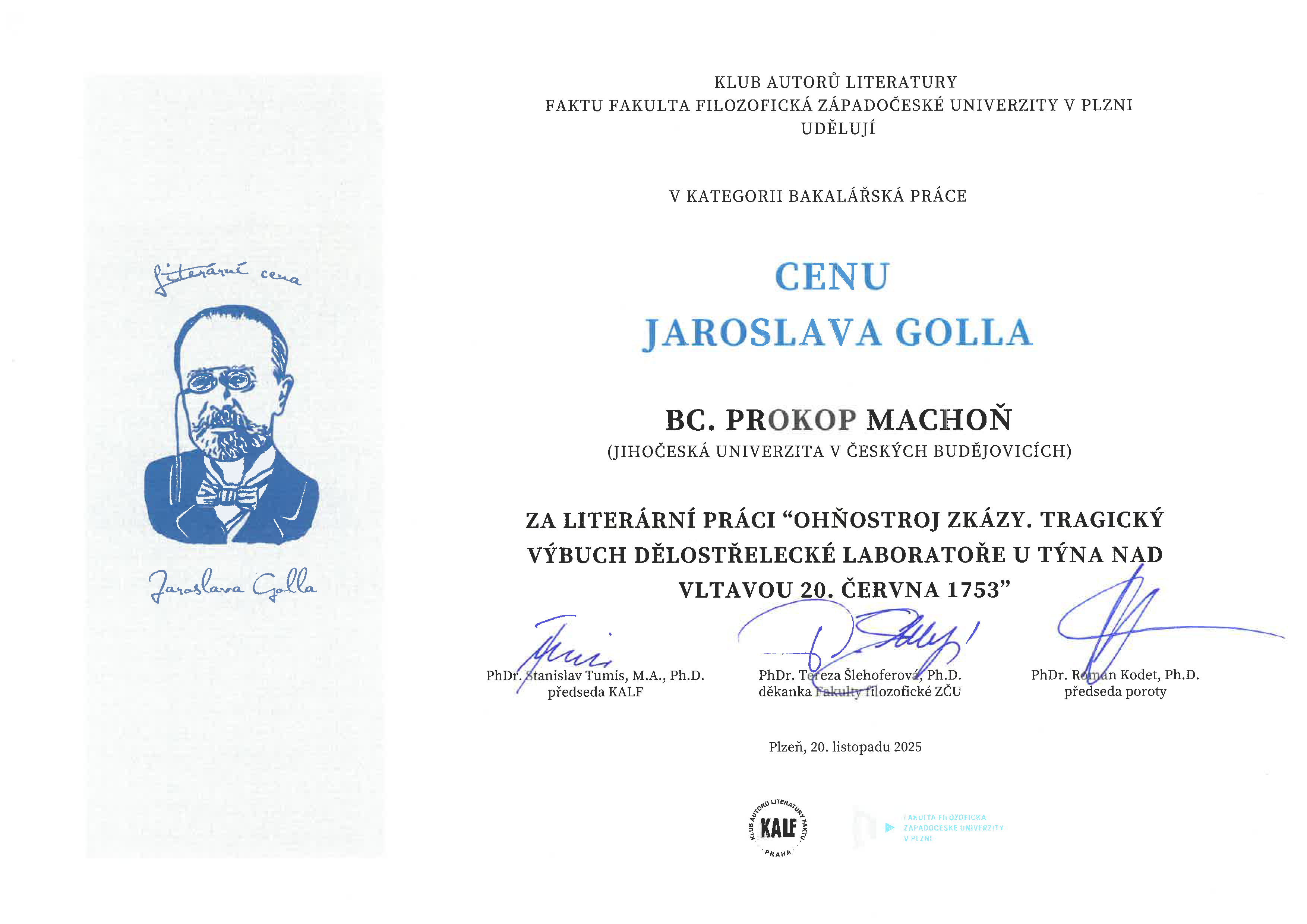 Student navazujícího magisterského studijního programu Archivnictví Bc. Prokop Machoň zaznamenal další úspěch: poté, co jeho práce Ohňostroj zkázy: Příčina a okolnosti výbuchu dělostřeleckých laboratoří u Týna nad Vltavou 20. června 1753 získala na jaře Cenu Josefa Šusty, udělovanou Sdružením historiků ČR, obdržel v listopadu t. r. za svou bakalářskou práci také Cenu Jaroslava Golla, kterou uděluje Fakulta filozofická Západočeské univerzity v Plzni a Klub autorů literatury faktu (KALF). Děkujeme za vynikající reprezentaci ústavu a blahopřejeme!
