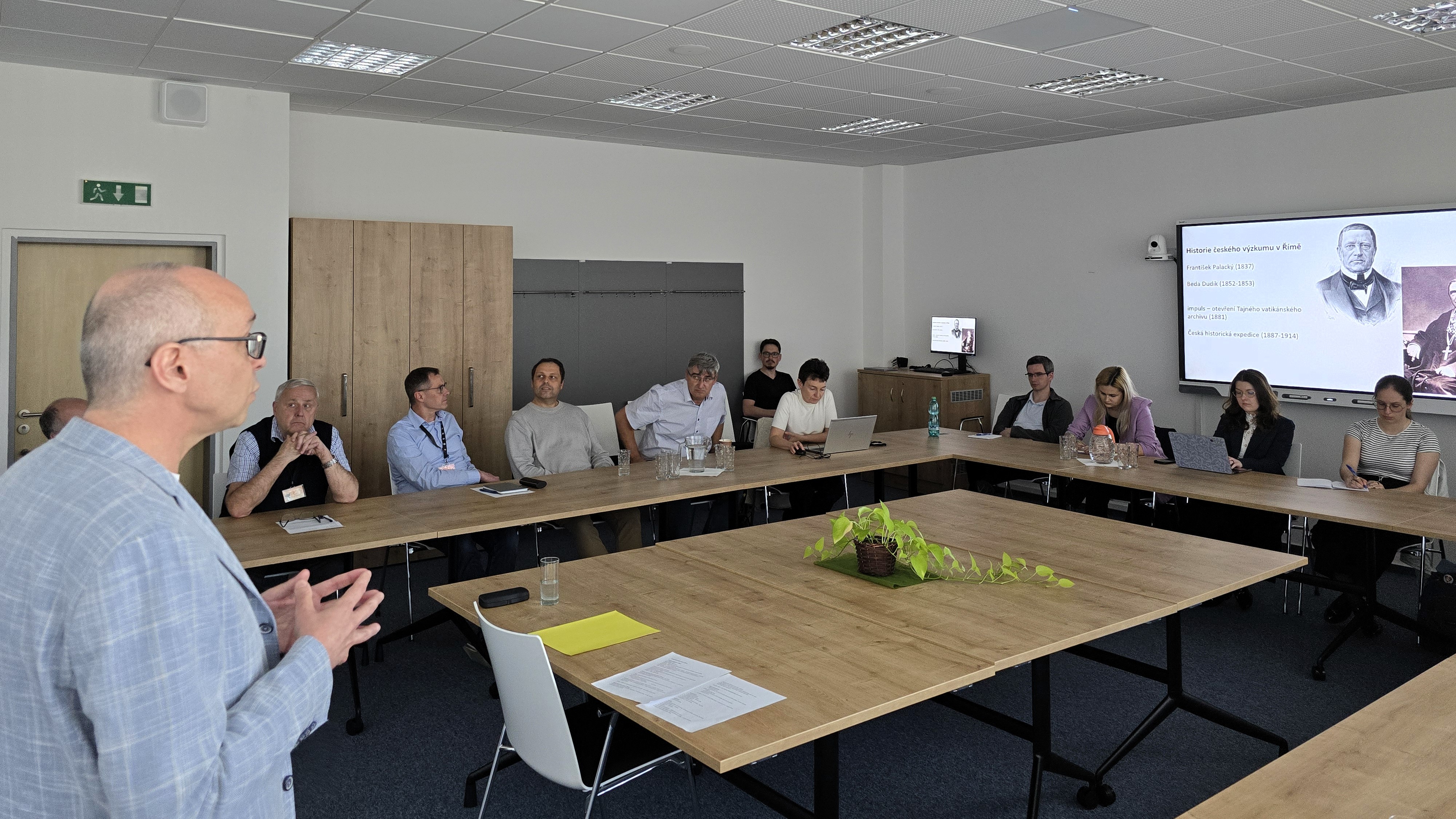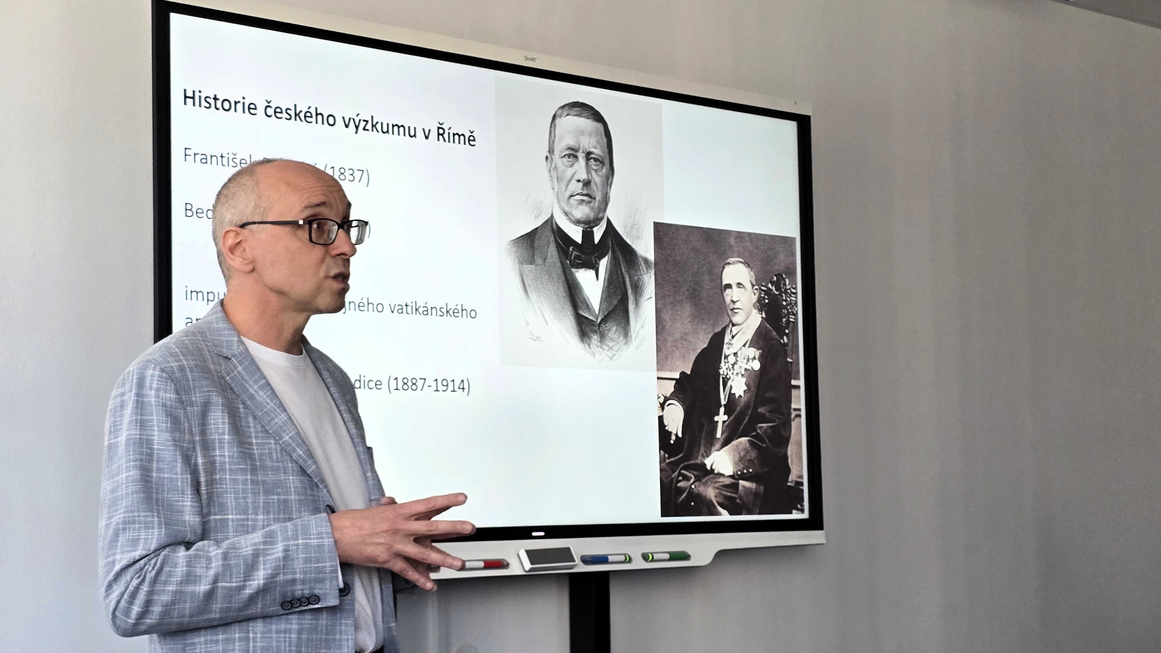 Ve středu 22. dubna 2026 zavítal na Historický ústav Filozofické fakulty Jihočeské univerzity doc. PhDr. Tomáš Černušák, Ph.D. Pro doktorandy ústavu a další zájemce z řad studentů i akademických pracovníků si nachystal workshop s názvem Český historický ústav v Římě: historie, stav a perspektivy výzkumu, který probíhal v zasedací místnosti Filozofické fakulty. Protože je Tomáš Černušák ředitelem Českého historického ústavu v Římě, předložil všem přítomným vysoce zasvěcený pohled na okolnosti vzniku, minulou i současnou činnost, vědecké výsledky a budoucí úkoly této významné instituce. V následné debatě ochotně odpovídal na všechny vznesené dotazy.
