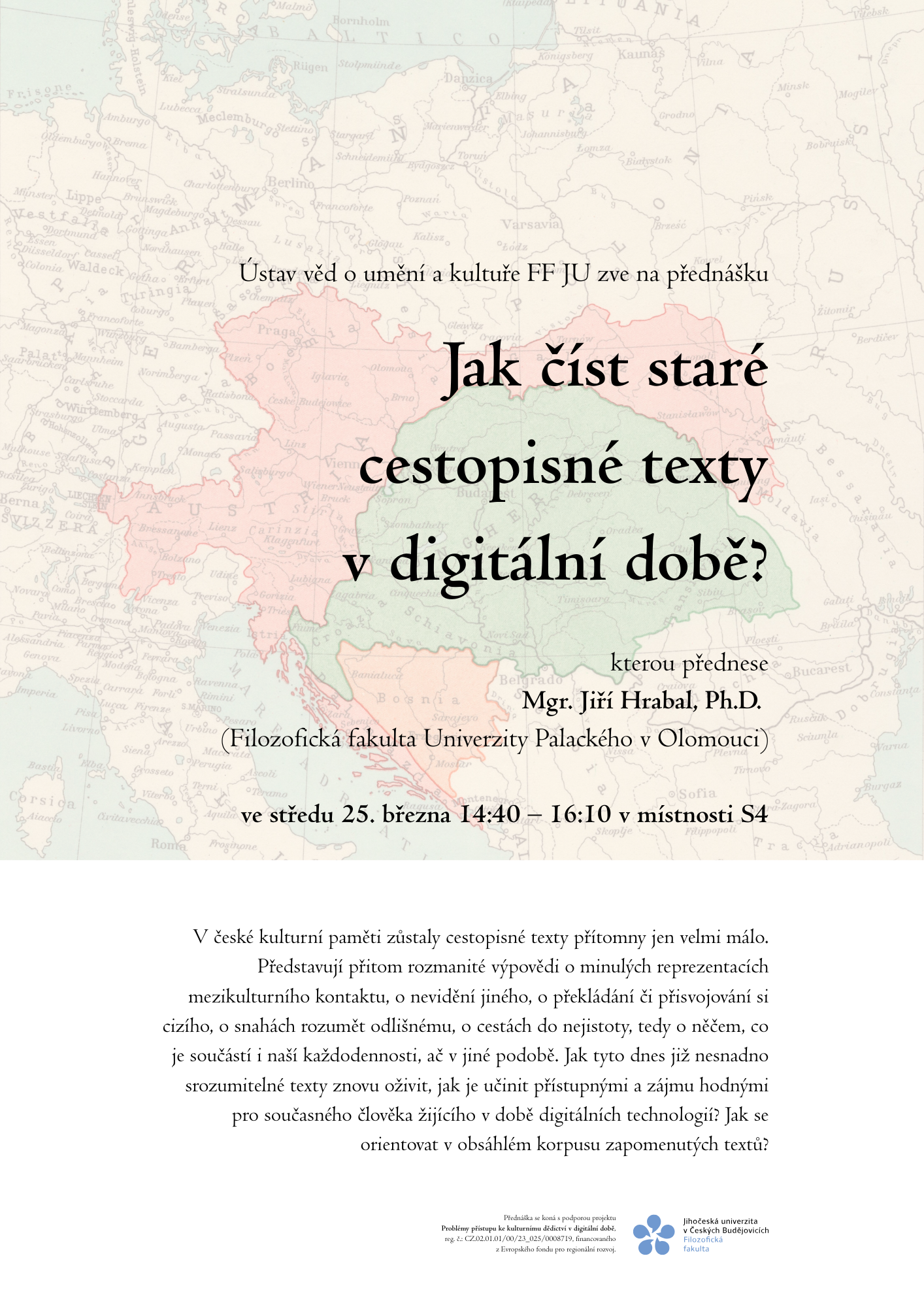 Jedná se o jednorázovou přednášku mimo pravidelnou výuku, na které dr. Hrabal představí způsoby digitálního oživování starších cestopisných textů a možnosti jejich prezentace i mimo výukovou či akademickou sféru. Po přednášce bude prostor na dotazy a další reakce.