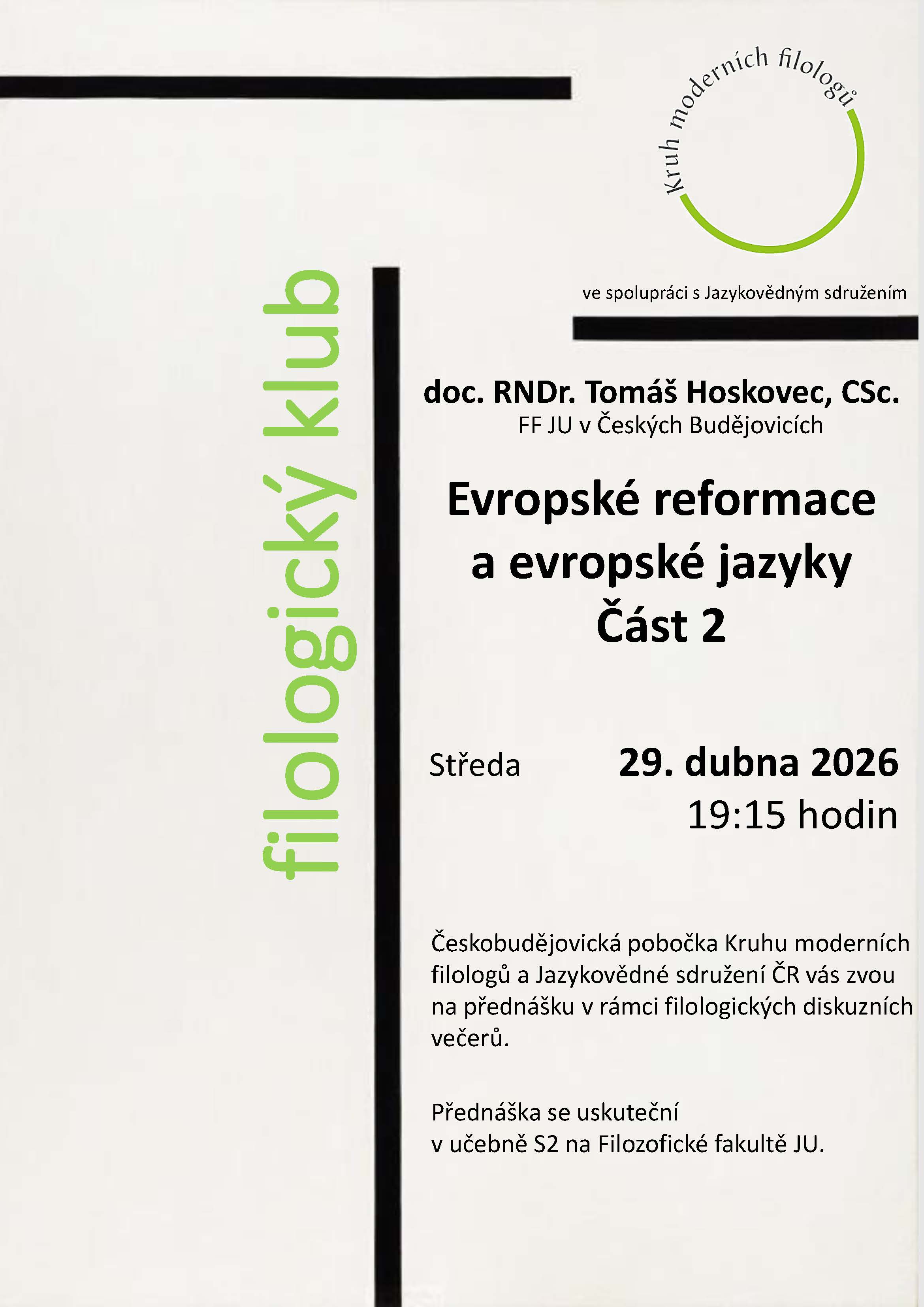 Přednáška se uskuteční v budově FF JU v seminární místnosti S2 v prvním patře.