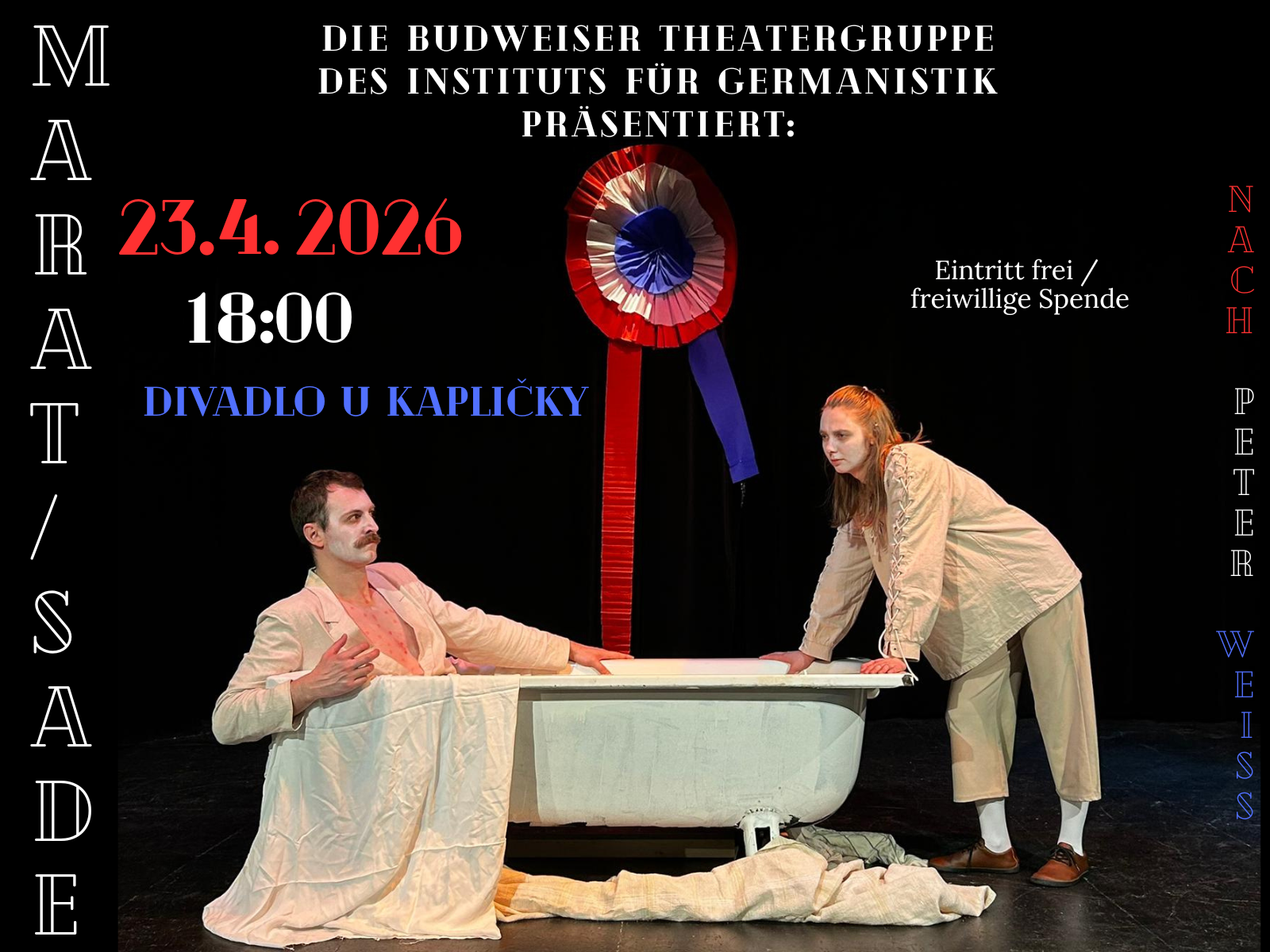 Studentská divadelní skupina Budweiser Theatergruppe z Ústavu germanistiky FF JU si pro Vás i tento rok připravila divadelní představení v němčině. Nenechte si ujít inscenaci hry německého spisovatele Petera Weisse Die Verfolgung und Ermordung Jean Paul Marats dargestellt durch die Schauspielgruppe des Hospizes zu Charenton unter Anleitung des Herrn de Sade.